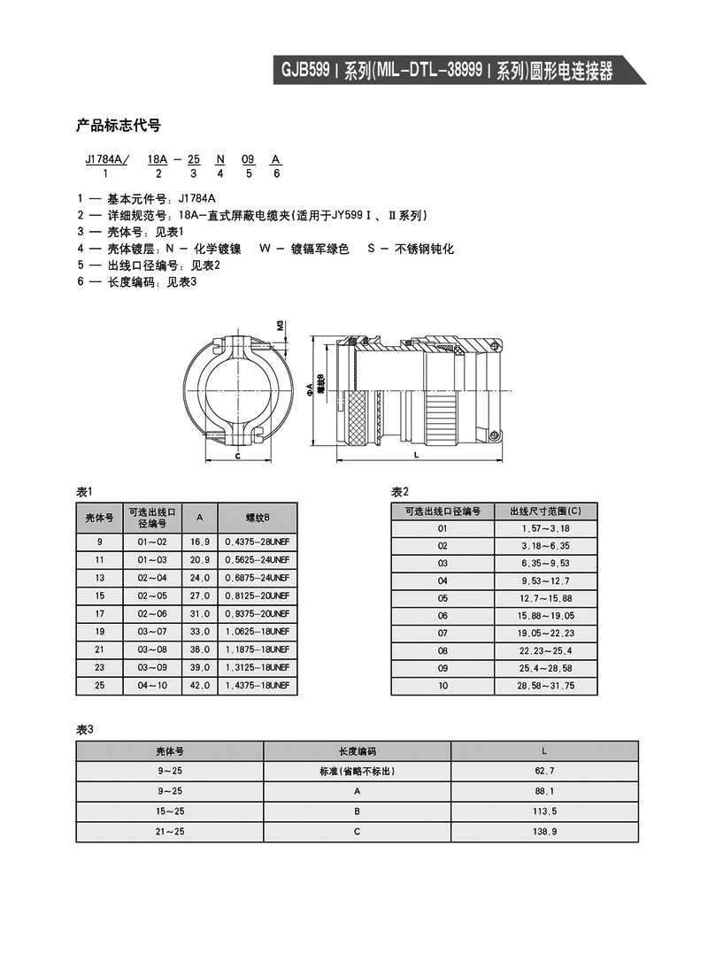 * 符合GJB 599A(MIL-DTL-38999K)Ⅰ 系列 * 卡口式快速连接 * 体积小,重量轻,接触偶密度高 * EMI / RFI 屏蔽 * 接触件压接可取卸,防斜插设计 * 插座有盒式、墙式、前装、后装及螺母紧固式安装等多种形式 * 具有抗高强度振动特性 * 符合GJB 1784A的标准尾部附件 * 适用于屏蔽电缆夹紧的专用尾部附件(Ti-Ni合金记忆环) * 9种壳体号,74种孔组排列 * 插合面界面及尾部具有密封结构,三防性能优良,防护等级可达到IP65 * 五键位导向机构,有五种防错插键位 * 广泛应用于航空、航天、兵器等军事系统及其他电子设备系统