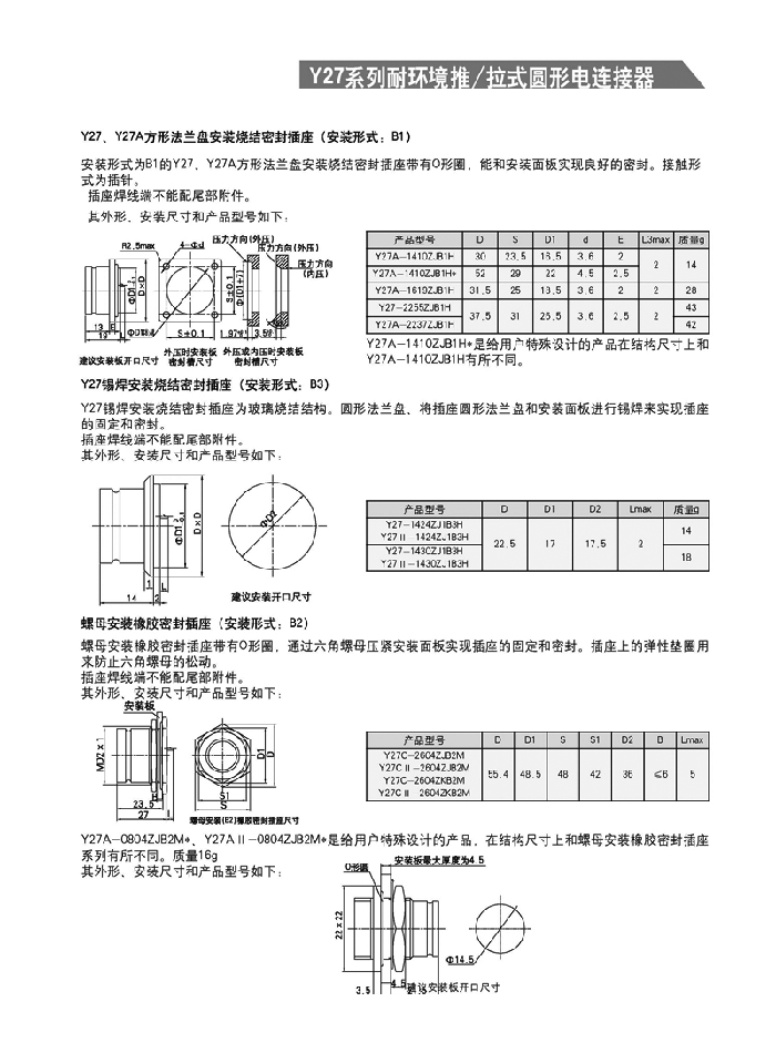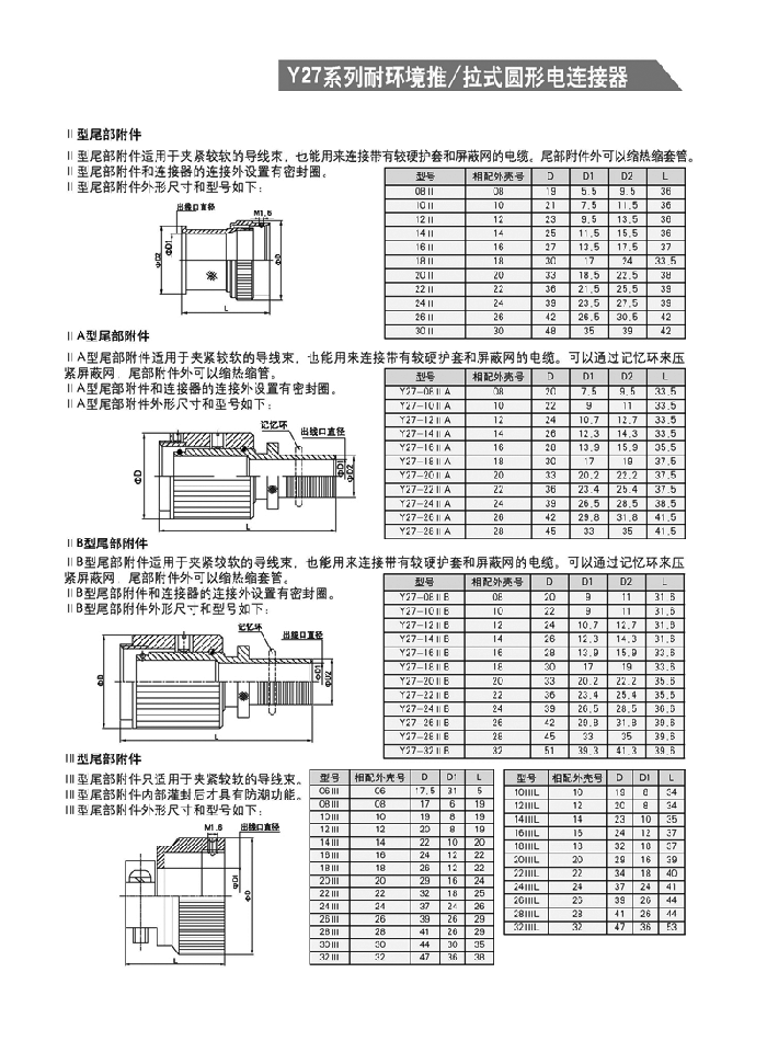 Y27系列耐环境推/拉式圆形航空插头 ,采用推/拉式锁紧机构,材料为铝合金、海军黄铜和不锈钢三种,共有13种壳体号,1~121等18种芯数,有3~250A等10种电流规格。Y27A系列电连接器有压接后松的品种。Y27F、G、H系列电连接器适用于舰船环境,具有防水密封的性能。Y27H系列电连接器采用双曲线插孔。符合国家军用标准GJB2905-97,性能参照美军标MIL-C-38999。 该系列航空插头连接和分离方便、快捷,适用于盲目插合或其他插合情况,具有抗振动、防盐雾、防电磁干扰的性能,有防尘、防雨及气体密封等品种。Y27系列电连接器广泛应用于航天、航空、船舶、通讯等领域。