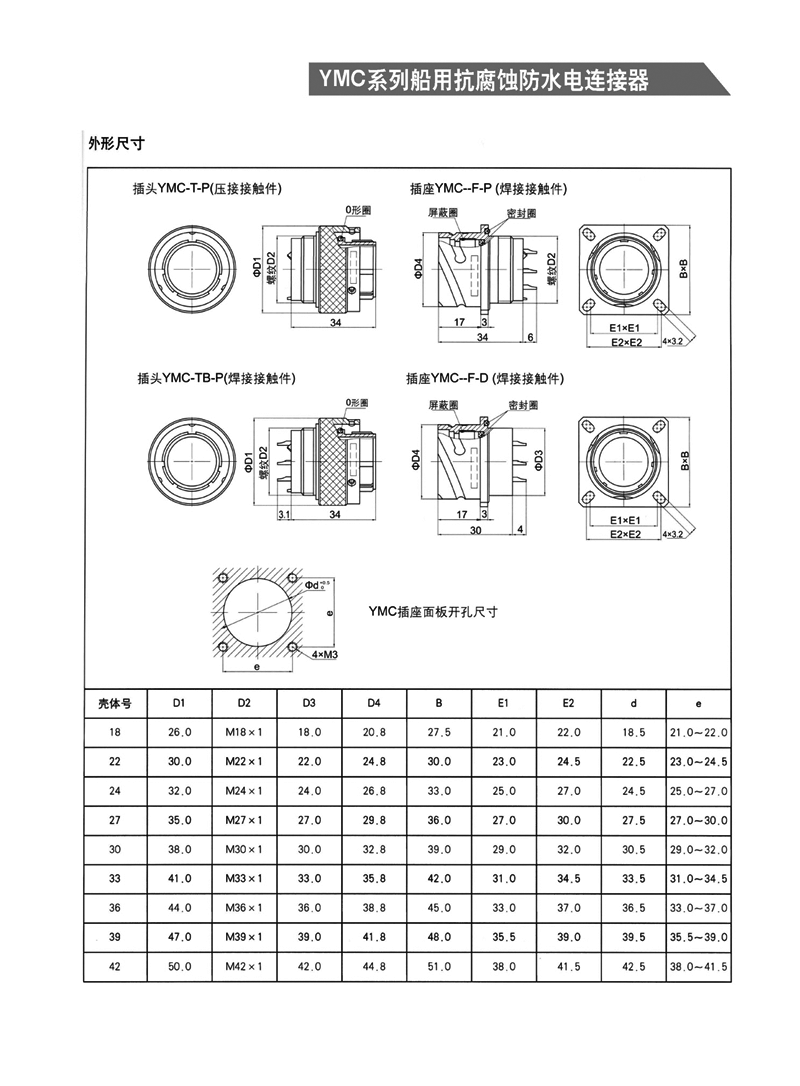YMC系列船用抗腐防水电连接器, 1. 适用于潮湿、浸水等恶劣环境下的设备与电缆、电缆与电缆 之间的电气连接 2. 可耐50米水深密封 3. 卡口式快速连接 4. 插头端接方式为压接,插座为焊接 5. 五键定位具有盲插和防错插功能 6. 高可靠的双曲面线簧插孔使连接器插拔柔和,接触电阻小 7. 插头、插座既可装针,也可装孔。